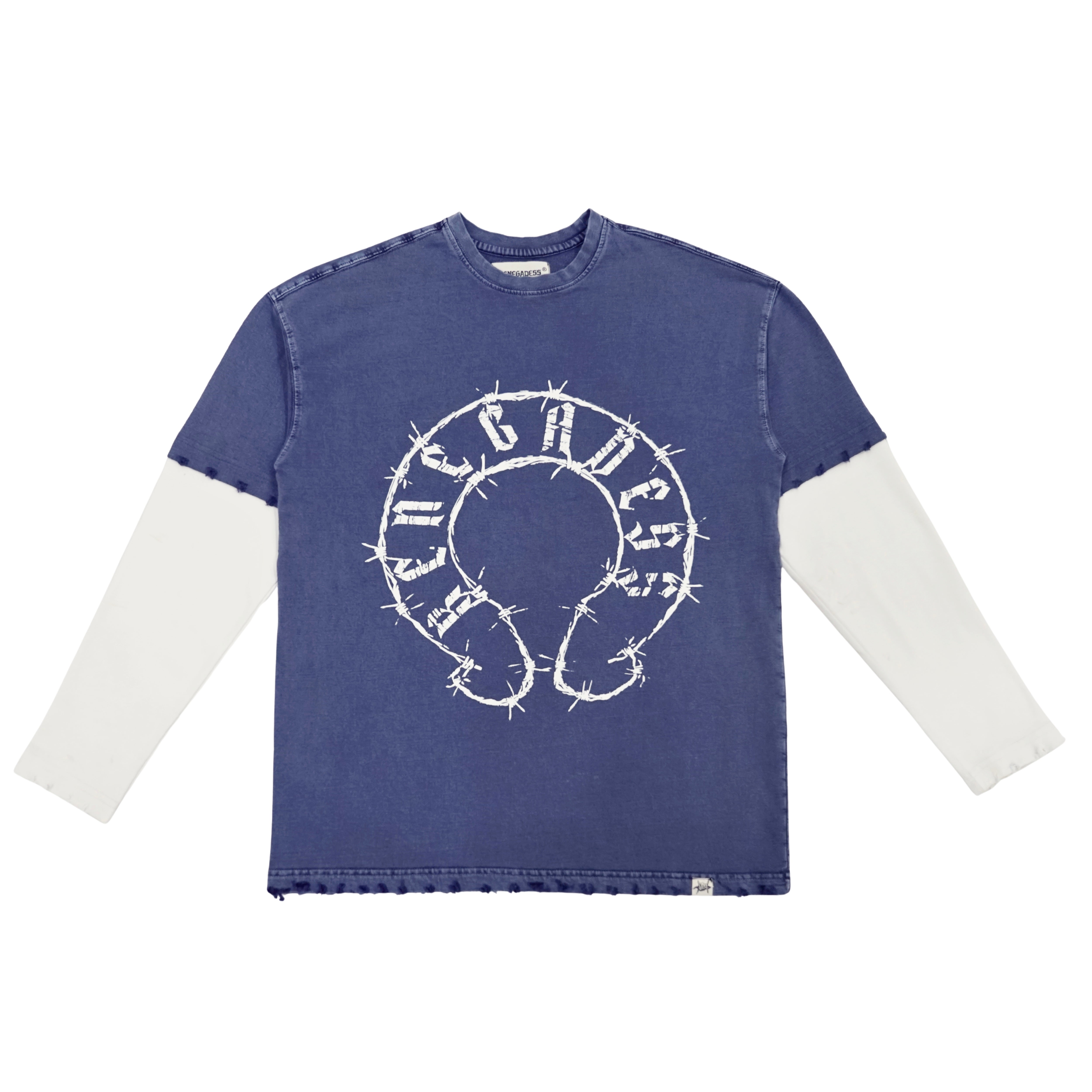 Oversized fit round neck t-shirt with add on full sleeves. Over-dyed with acid-washed treatment. Printed on the front panel. Distressed cuffs, bottom hem and neckline. Limited to only 50 pieces.