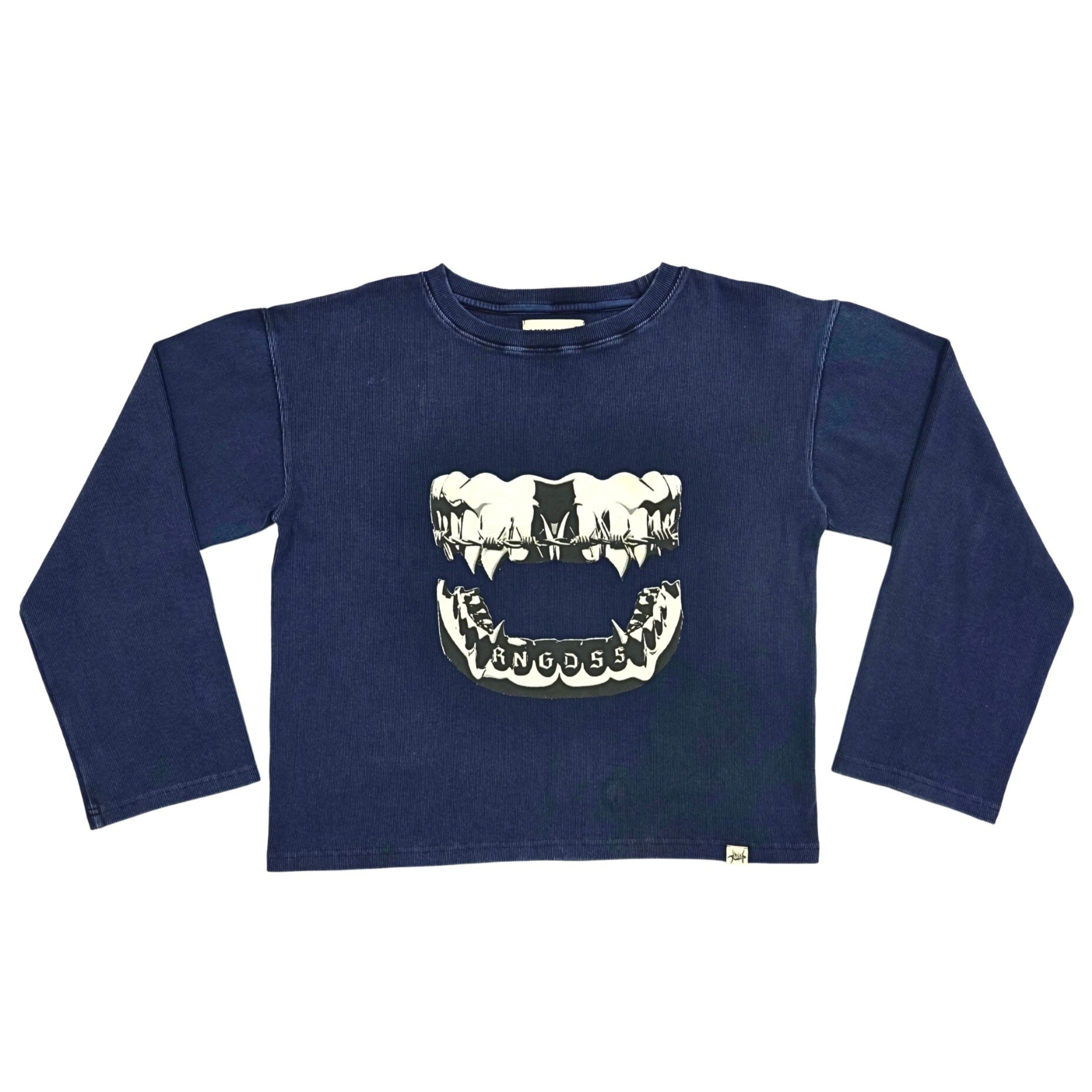 Cropped fit rib pullover with flared sleeves, printed on front and back. Over-dyed with washed treatment. Distressed Rib-knit cuffs and bottom hem. Limited to only 50 pieces.